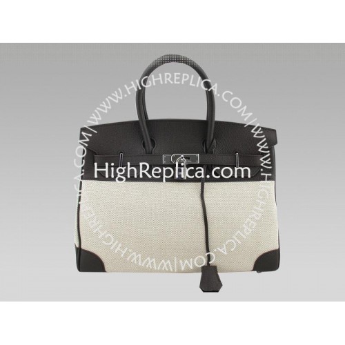 Nasza replika HERMES BLACK TOGO AND TOILE BIRKIN ma dużą wewnętrzną komorę wyłożoną soczystą skórą szewrową, dużą płaską, wewnętrzną kieszeń, srebrne okucia pokryte palladem, Zamek i klucz Hermes z wytłoczeniem Hermes, cztery ochronne nóżki zapobiegają śladom i zadrapaniom na podstawie. Duże, podwójnie zwinięte uchwyty umożliwiają noszenie lub noszenie tej torby na ramieniu.