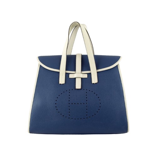 Torebka Hermes 08c z klapką w kolorze niebieskim z lamówką ze skóry w kolorze złamanej bieli