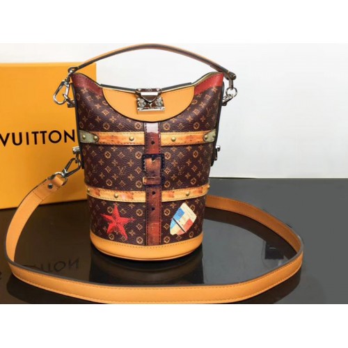 Torebka Duffle Time Trunk stanowi zabawny zwrot w podpisach Izby Reprezentantów na jesień-zimę 2018. Malowniczy efekt na przekształconym płótnie Monogram zwraca uwagę na jasne, historyczne naklejki na bagaż. Zapięte paski i złote ćwieki nawiązują do korzeni domu, tworząc tułów, tworząc przy tym efekt trompe l’oeil. Starzejące się srebrne okucia dopełniają inspirowany stylem vintage wygląd torby.