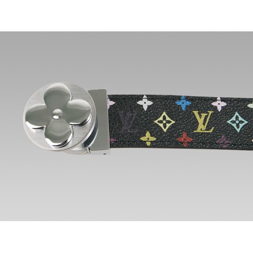 Pasek Louis Vuitton w kolorze czarnym i wielokolorowym z okrągłą, srebrną klamrą w kształcie kwiatu