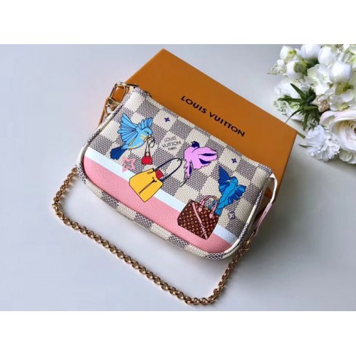Inspirowane świątecznymi oknami Louis Vuitton w Galeries Lafayette w Paryżu, akcesoria Mini Pochette z płótna Damier Azur są ozdobione nadrukiem fantazyjnych bawiących się ptaków. Dzięki złotemu łańcuszkowi tę szykowną saszetkę można przymocować do innej torby lub nosić ją samodzielnie.