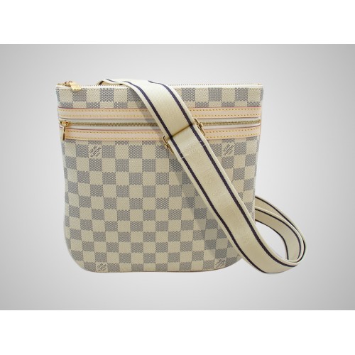 Louis Vuitton prezentuje lekką i praktyczną płaską torebkę z płótna Damier Azur, idealną do użytku miejskiego lub podróżniczego. Przednia kieszeń zapinana na zamek zapewnia wygodny dostęp do telefonu komórkowego, iPoda lub innych akcesoriów, podczas gdy zapinana na zamek główna komora mieści wszystkie niezbędne rzeczy na co dzień lub w podróży.