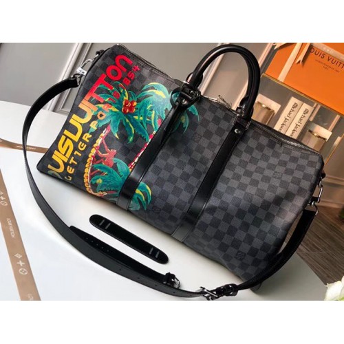 Zainspirowany pokazem mody męskiej na wiosnę/lato 2018 r. motyw Jungle obejmuje zabawny nadruk palmy i tęczowy podpis Louis Vuitton w stylu deski surfingowej na płótnie Damiera Cobalta. Kultowa torba podróżna Keepall 45 Holdall, oryginalna miękka torba podróżna, to stylowy i praktyczny wybór na weekendowy wypad.