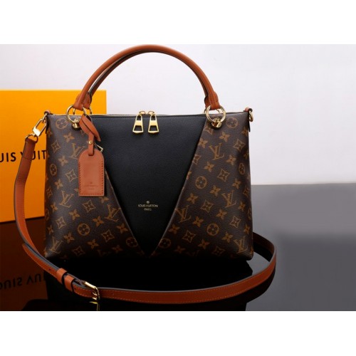 Jesienią-zimą 2018 płótno Monogram jest łączone ze skórą ziarnistą w torebce V Tote MM. Posiada przedni panel ze skóry bydlęcej w kształcie litery V, nawiązujący do inicjału Vuittona, który kryje przednią kieszeń zapinaną na zamek. Złote okucia i grawerowane pierścienie do mocowania uchwytu LV dodają blasku tej eleganckiej i funkcjonalnej torbie.