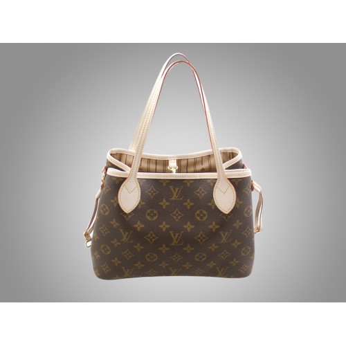 W płótnie Monogram ta wersja Neverfull jest małą wersją z rodziny. Posiada tę samą pasiastą podszewkę płócienną, co klasyczne kufry House