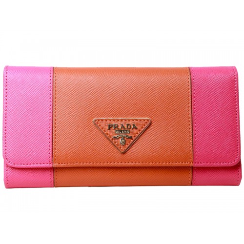 Prada Saffiano skórzany portfel składany na trzy części, intensywny róż z pomarańczowym