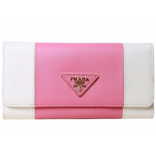 Prada Saffiano skórzany portfel składany na trzy części, biały z różowym