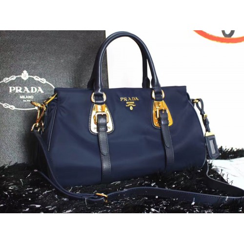 Prada Tessuto Nylonowa torba z miękkiej skóry cielęcej z uchwytem u góry, niebieska