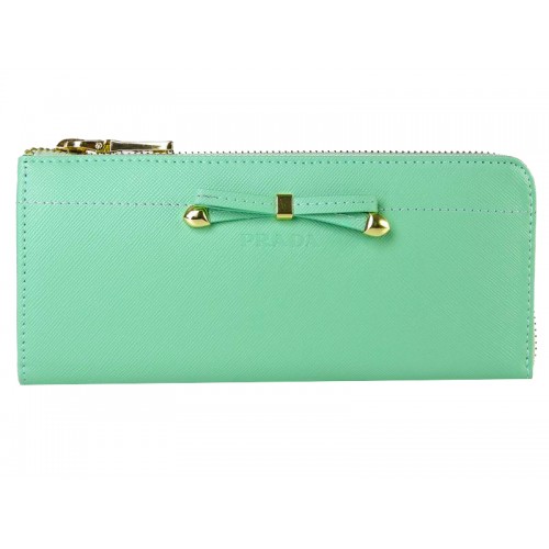 Portfel Prada Saffiano z zamkiem błyskawicznym i kokardką w kolorze jasnozielonym