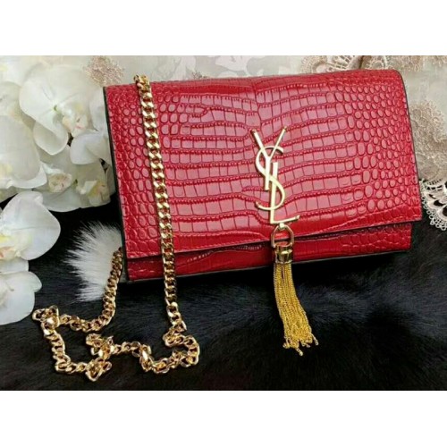 • Saint Laurent Kate Medium z frędzlami, skóra krokodyla, błyszcząca, czerwona